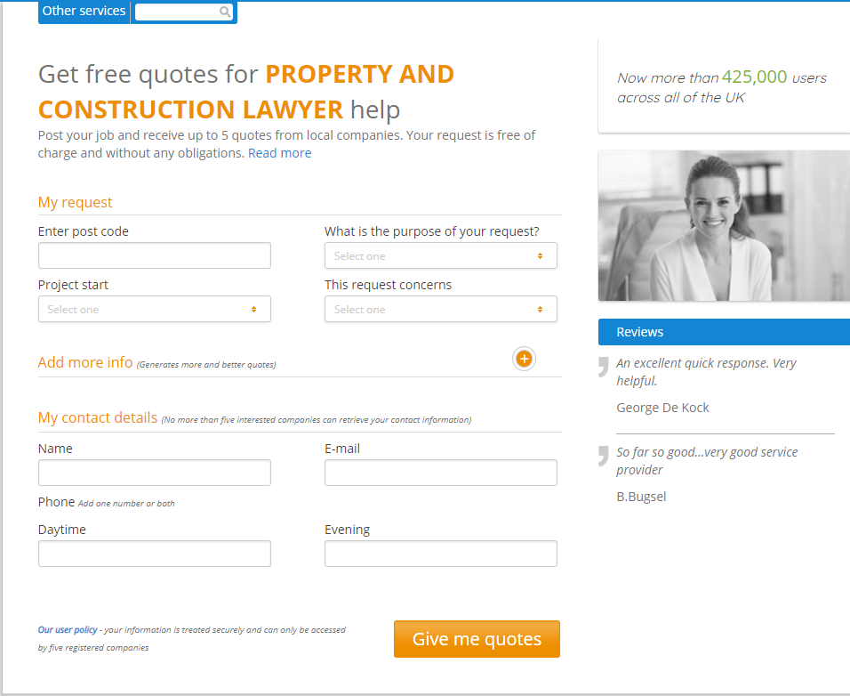 A Comparison site for Miscellaneous Services. The form may seem involved but it’s an easy thing to do. The way the site is designed meets it’s target audience’s requirements (C1C2 profile) of getting the best value for money. Similar to the one for lawyers in the Standard website section.