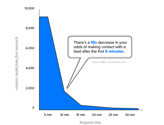 This graph was compiled over 9,000 people so is very accurate. Only 1 in 10 prospective customers will wait for you or call you back after 10 mins has elapsed and a 10X decrease after 5 mins.